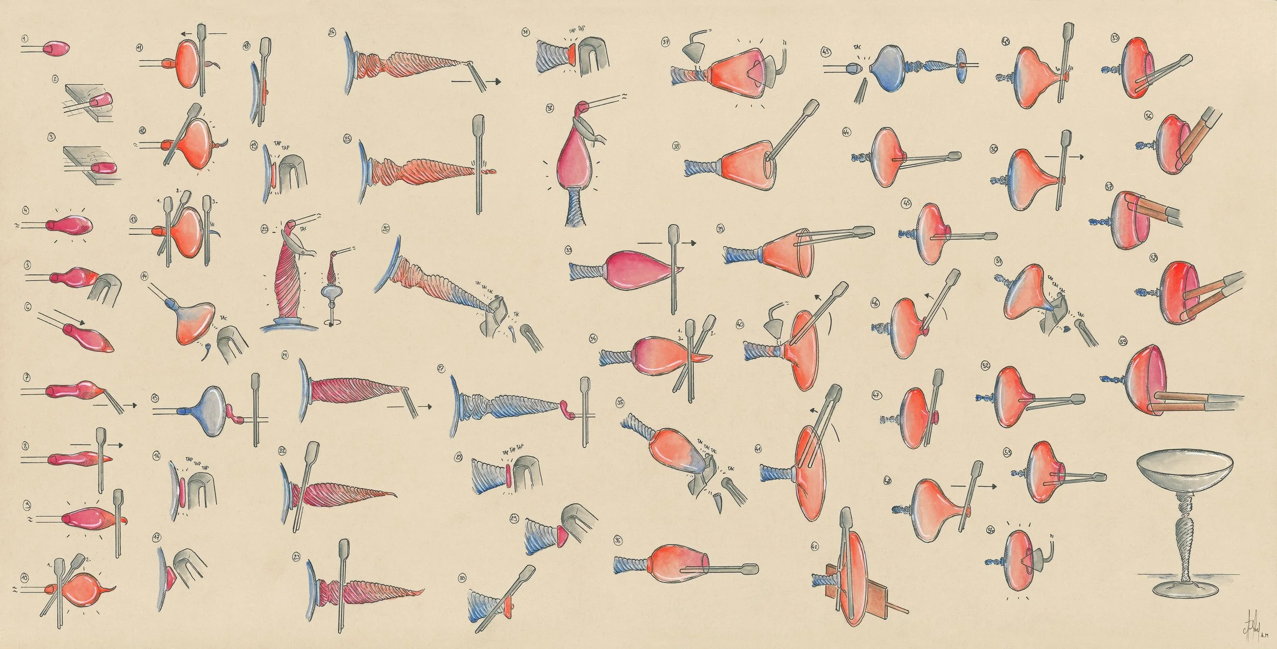 The objective of the 'Trust the process' project is to capture all aspects of the glassmaking process, highlighting the tools used and the interaction between the different heat stages involved in working with glass. The aim is to convey the beauty and complexity of this art through illustrations, capturing the very essence of the creative process